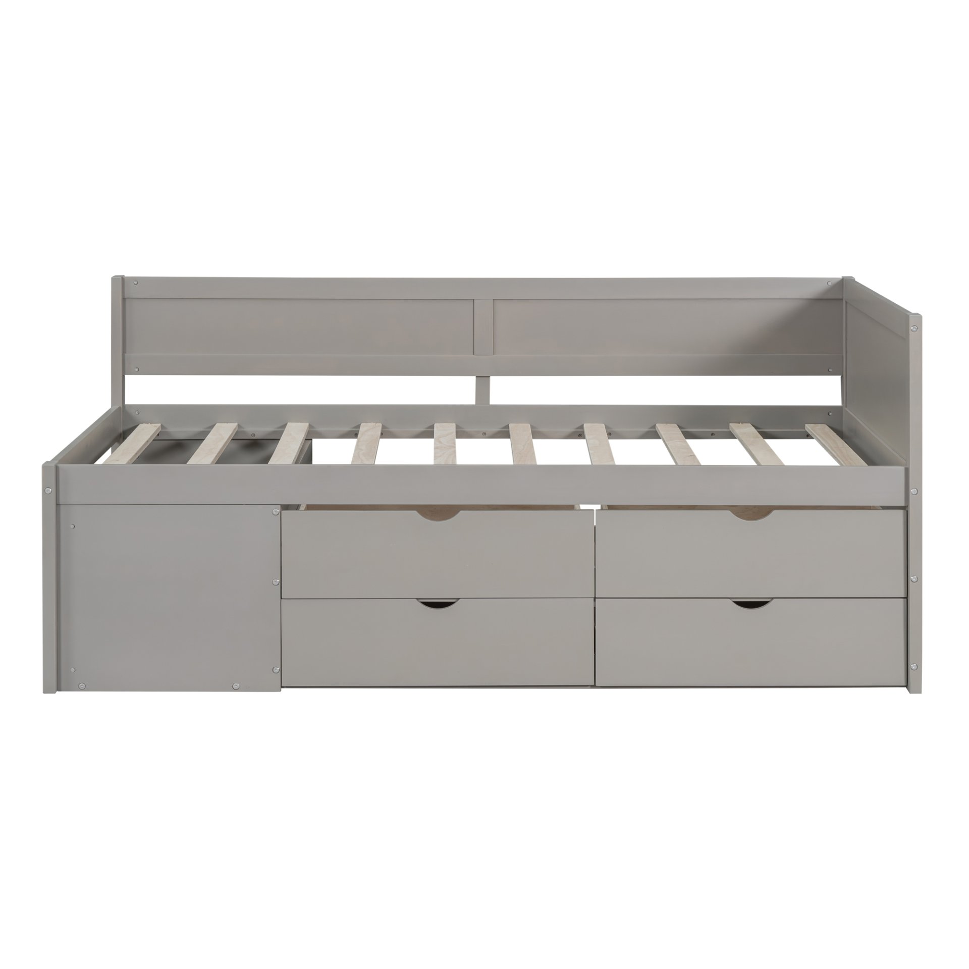 The daybed with handy pull-out drawers and three functioning shelves takes up minimal space, perfect for organizing anything from clothes and bed linens to toys and games. Such a versatile piece, bringing functionality, versatility, and style to your home, perfect for those who have limited space. High-quality, solid and a strong, durable frame ensures stability and durability for long-term use. Slat kit included so box springs are not required. This daybed is designed with a clean silhouette and a hue of elegance. It suits all styles of home decoration, and completes the look of any bedroom.