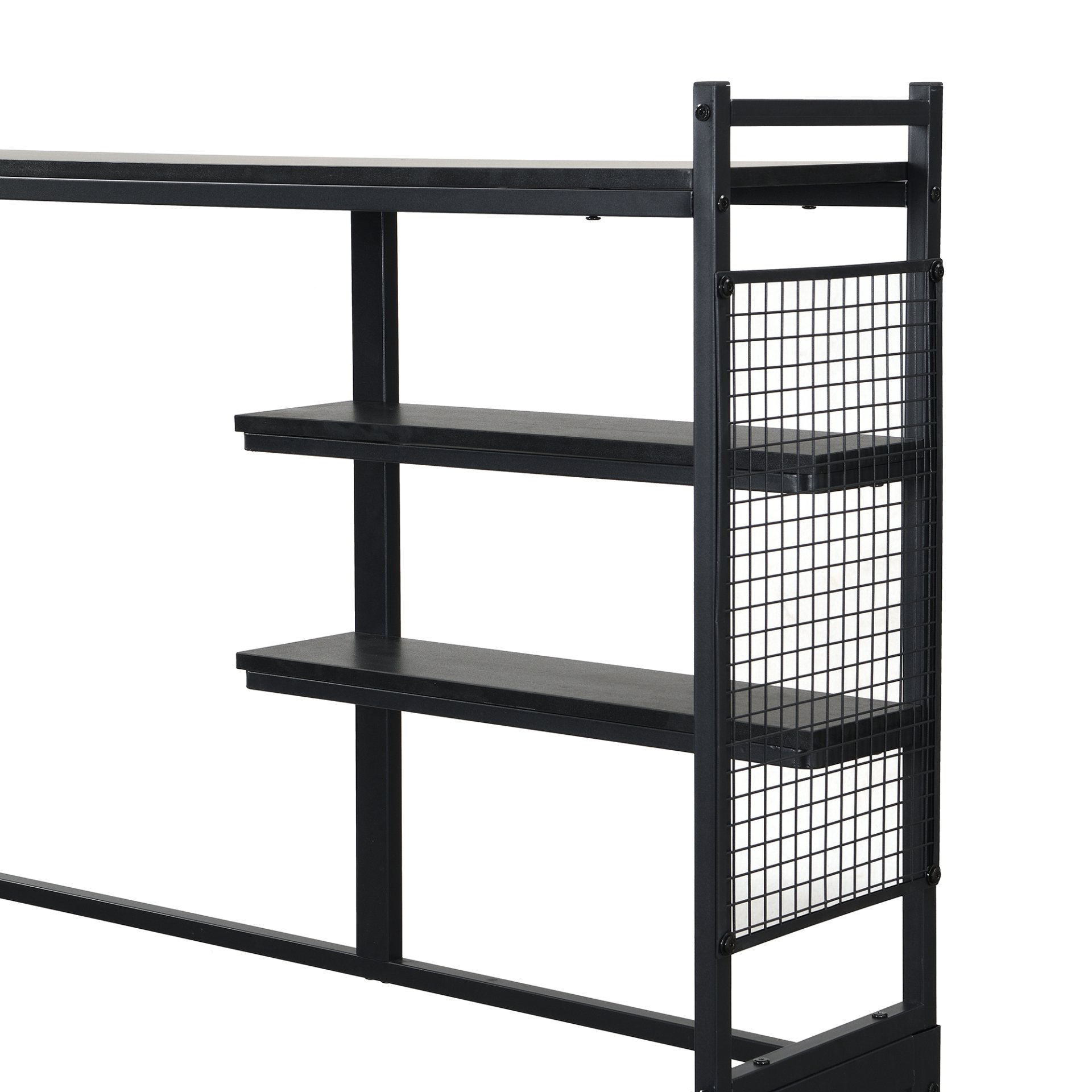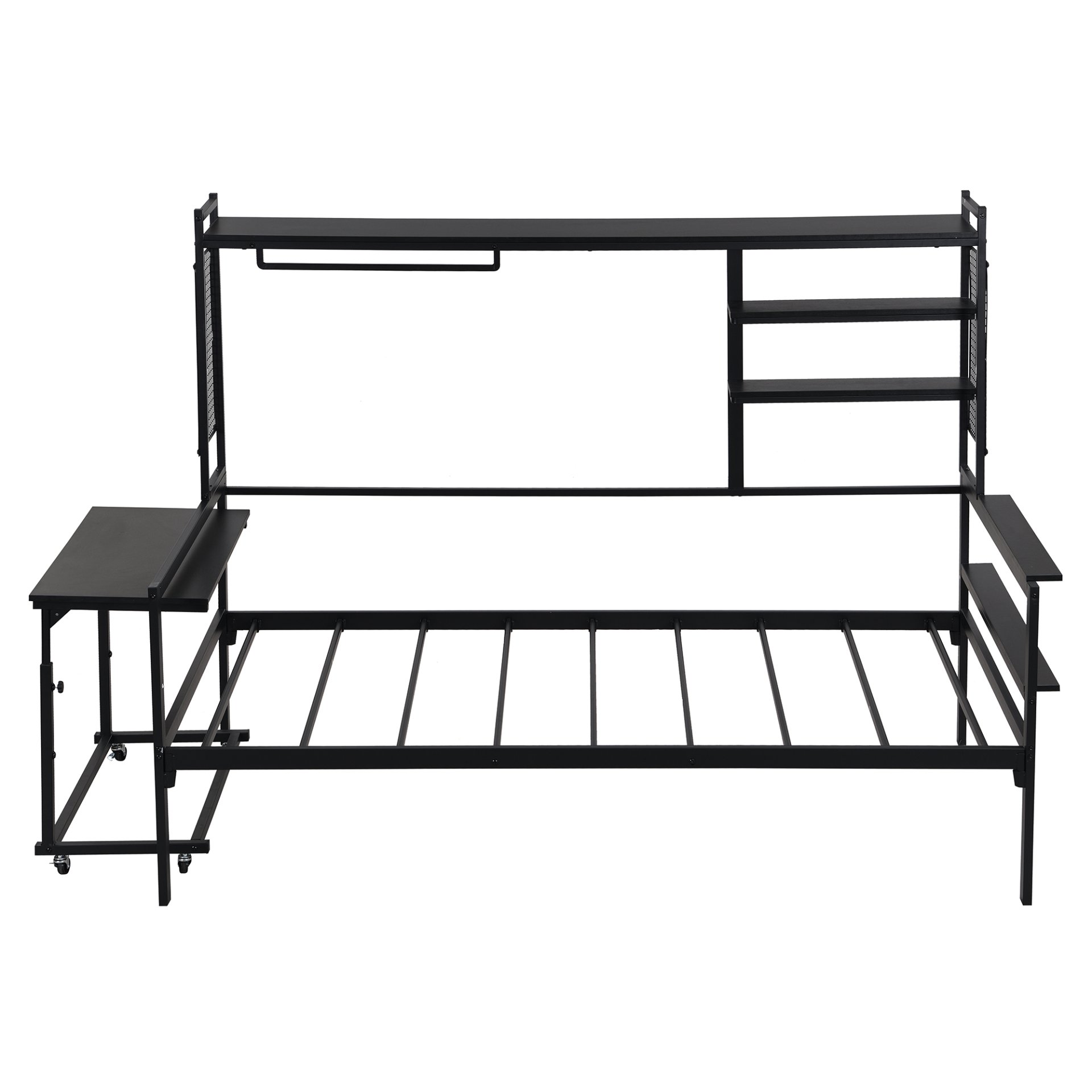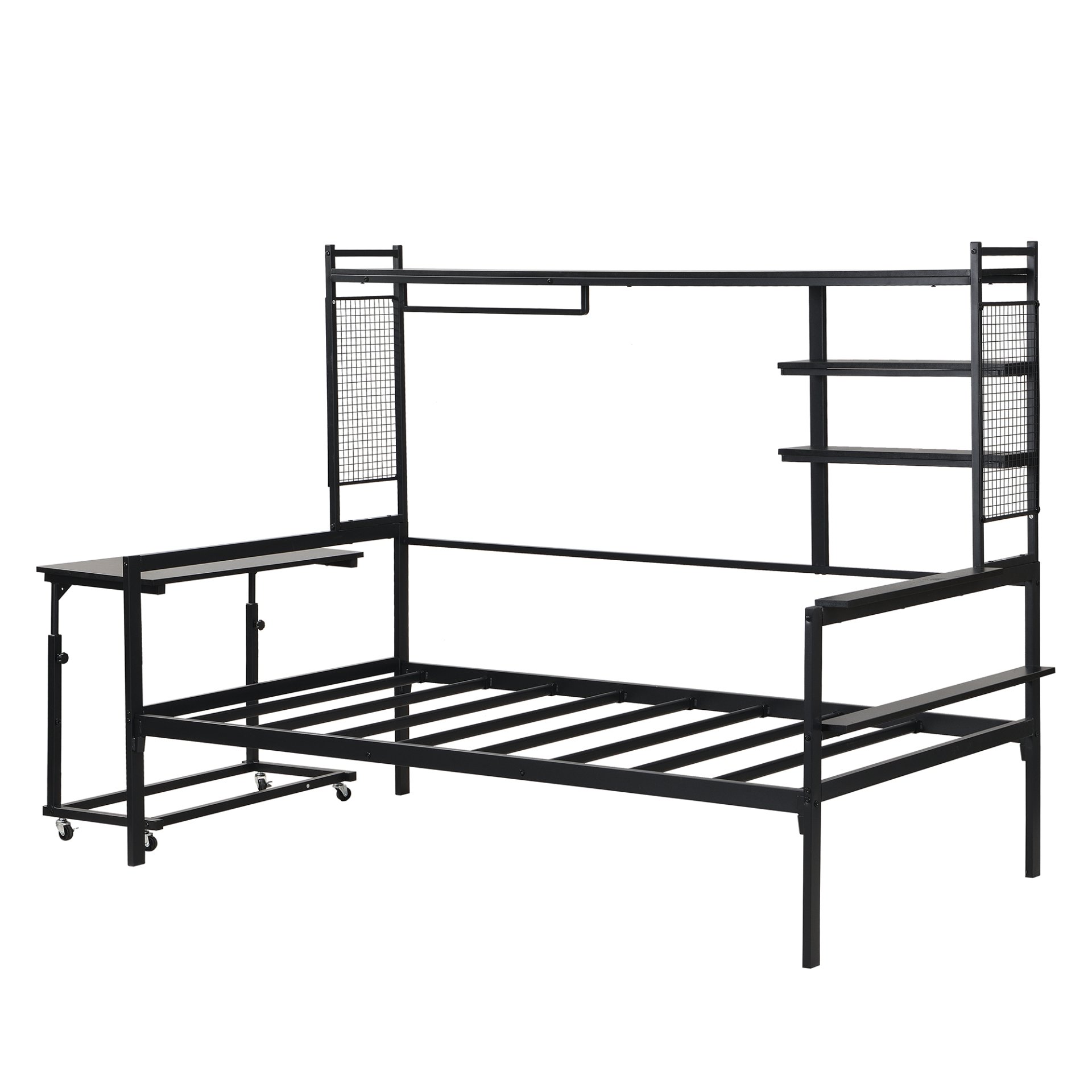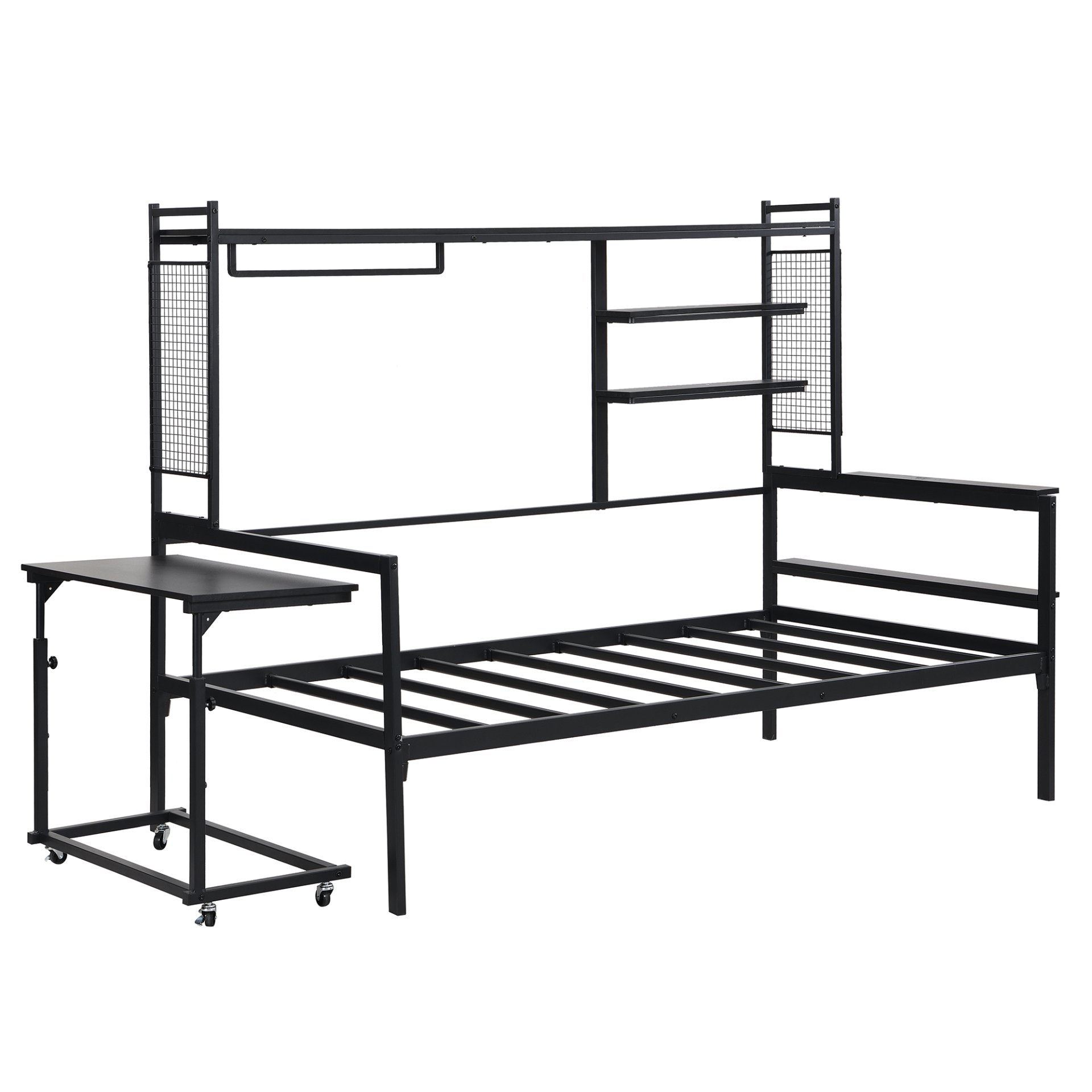 Maximize both style and functionality with this Metal Daybed, designed to meet the needs of modern living. Whether you're creating a cozy reading nook, a guest bed, or an efficient workspace, this versatile daybed has it all. Featuring a movable desk, metal grids, multiple shelves, and a clothes hanger, it combines industrial charm with practical storage solutions to enhance any room in your home.
