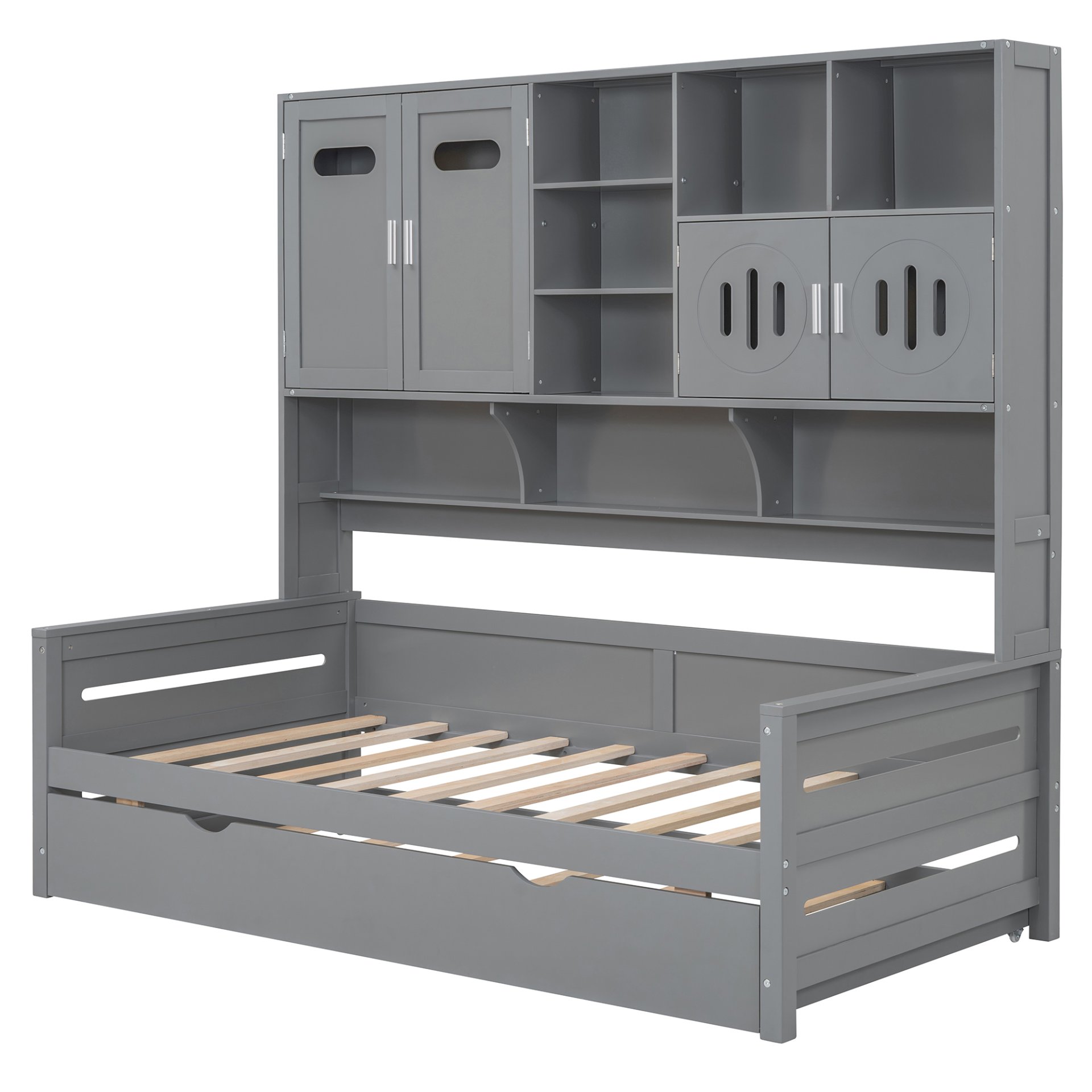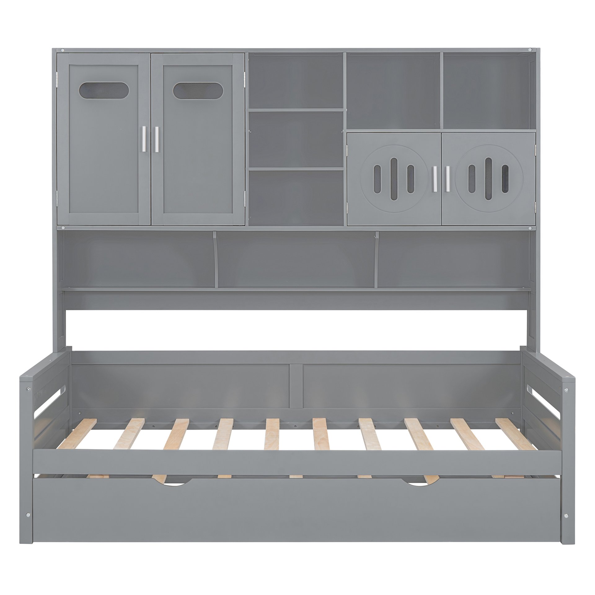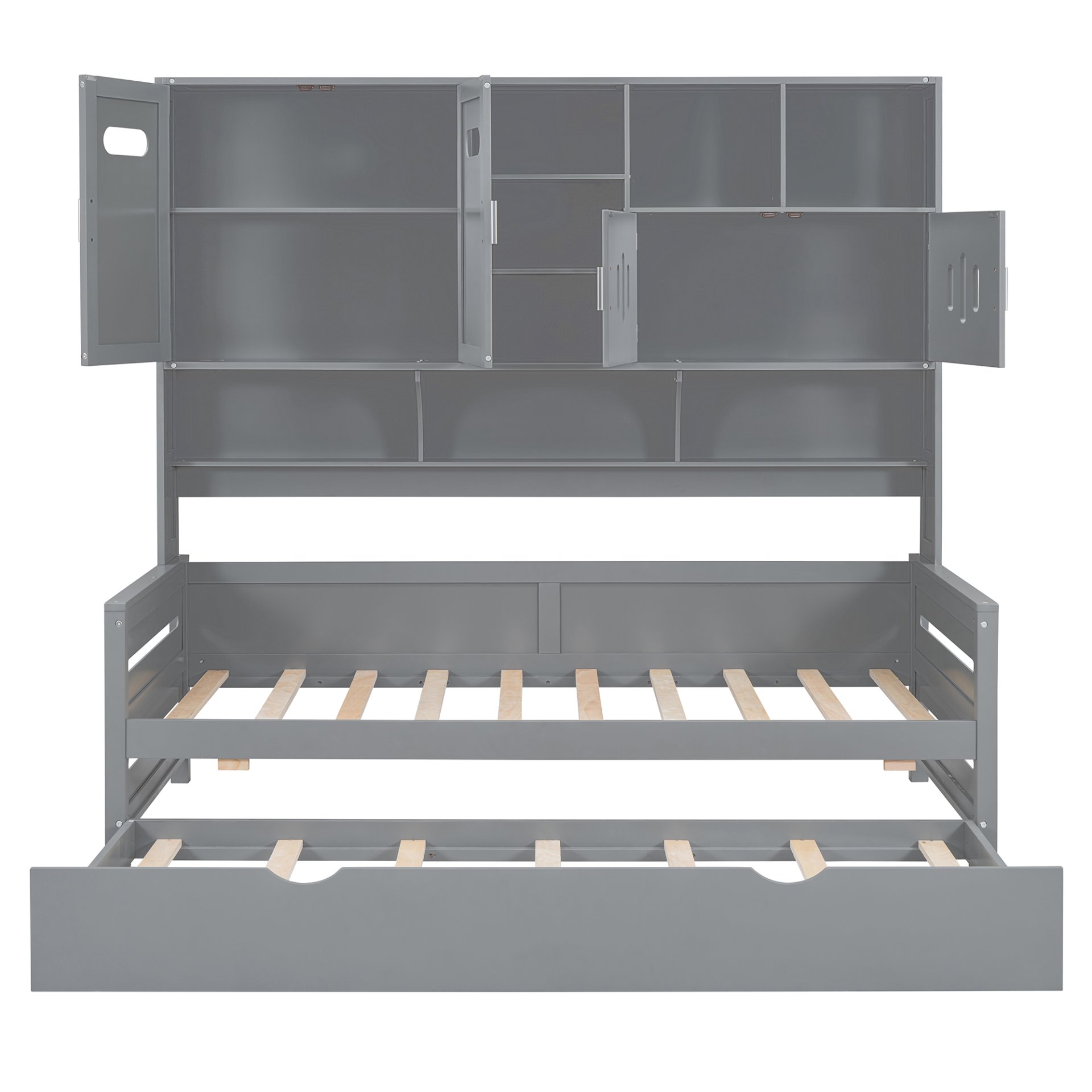Wooden daybed With All-in-One Cabinet and Shelf will be perfect touch for your bedroom. There are shelves and cabinets designed at the back of the bed,a roll-out twin size trundle is fitted underneath for the spontaneous sleepover guest. The high-quality wood and hardware ensure not only the stability but also the good-looking of the bed.