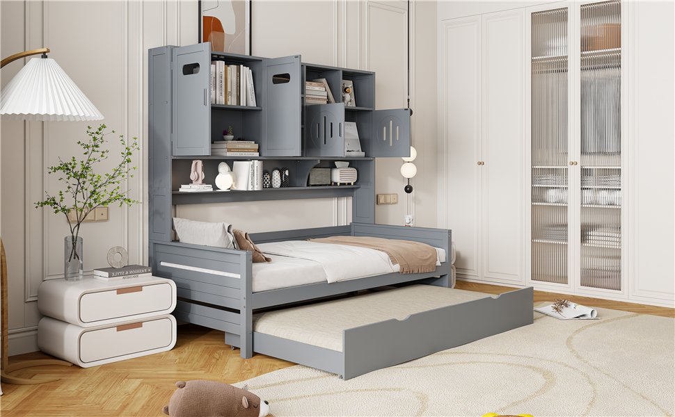 Maximized space: The daybed takes up minimal space for two, while a roll-out trundle is fitted underneath for the spontaneous sleepover guest. Twin size trundle under the daybed can be slided in and out very smoothly, which takes full advantage of the space under the bed. There are shelves and cabinets designed at the back of the bed, you can put in whatever you want into them.