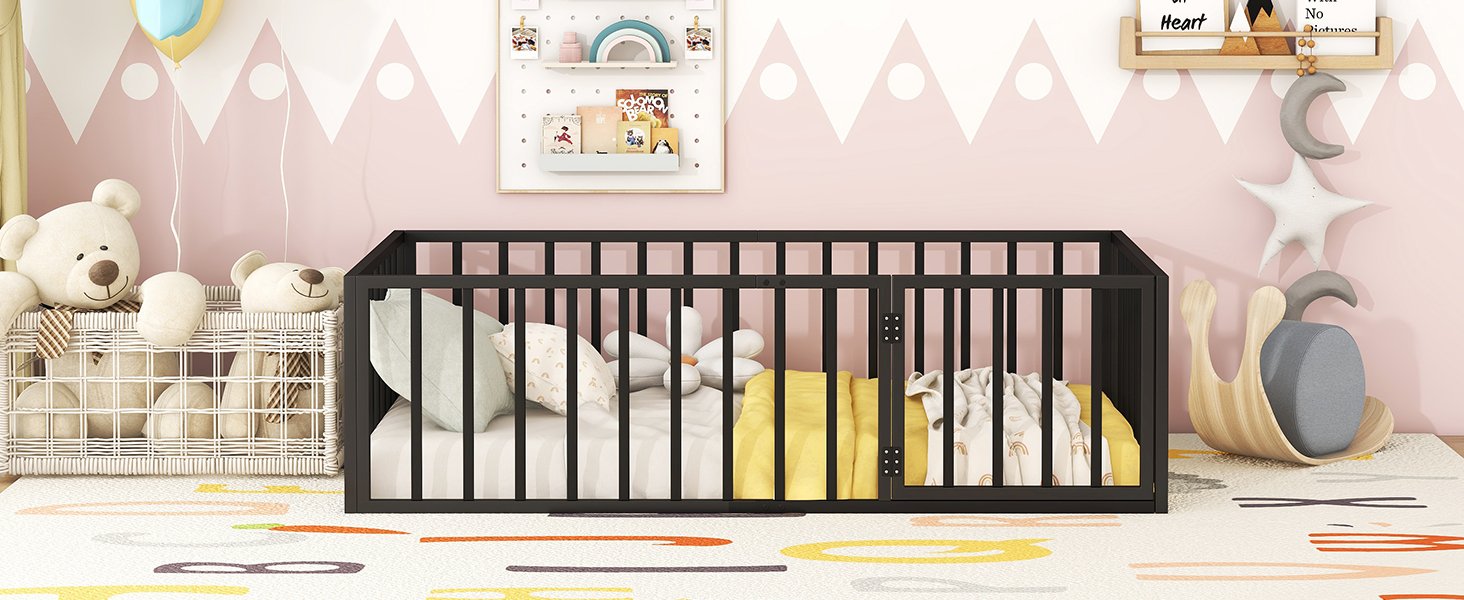 Fun Design: This metal floor bed frame features a circle of fencing and a small door that can be opened and closed, adding interest to the bed and creating a safer sleeping space.