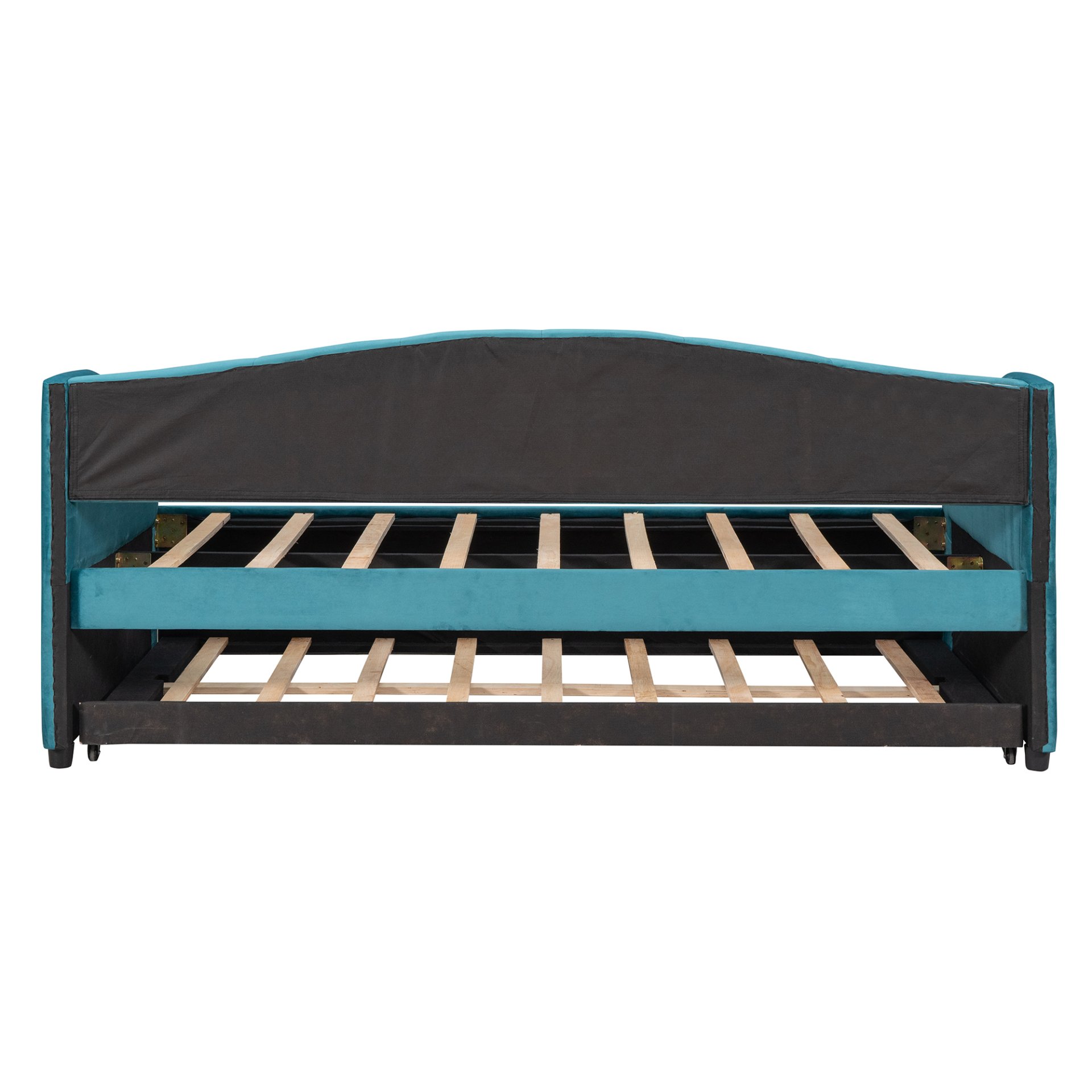 No Box Spring needed: This daybed frame comes with sturdy wooden slats. Mattress is not included. A comfy velvet fabric backrest and two armrests that bring you and your family a cozy feeling.