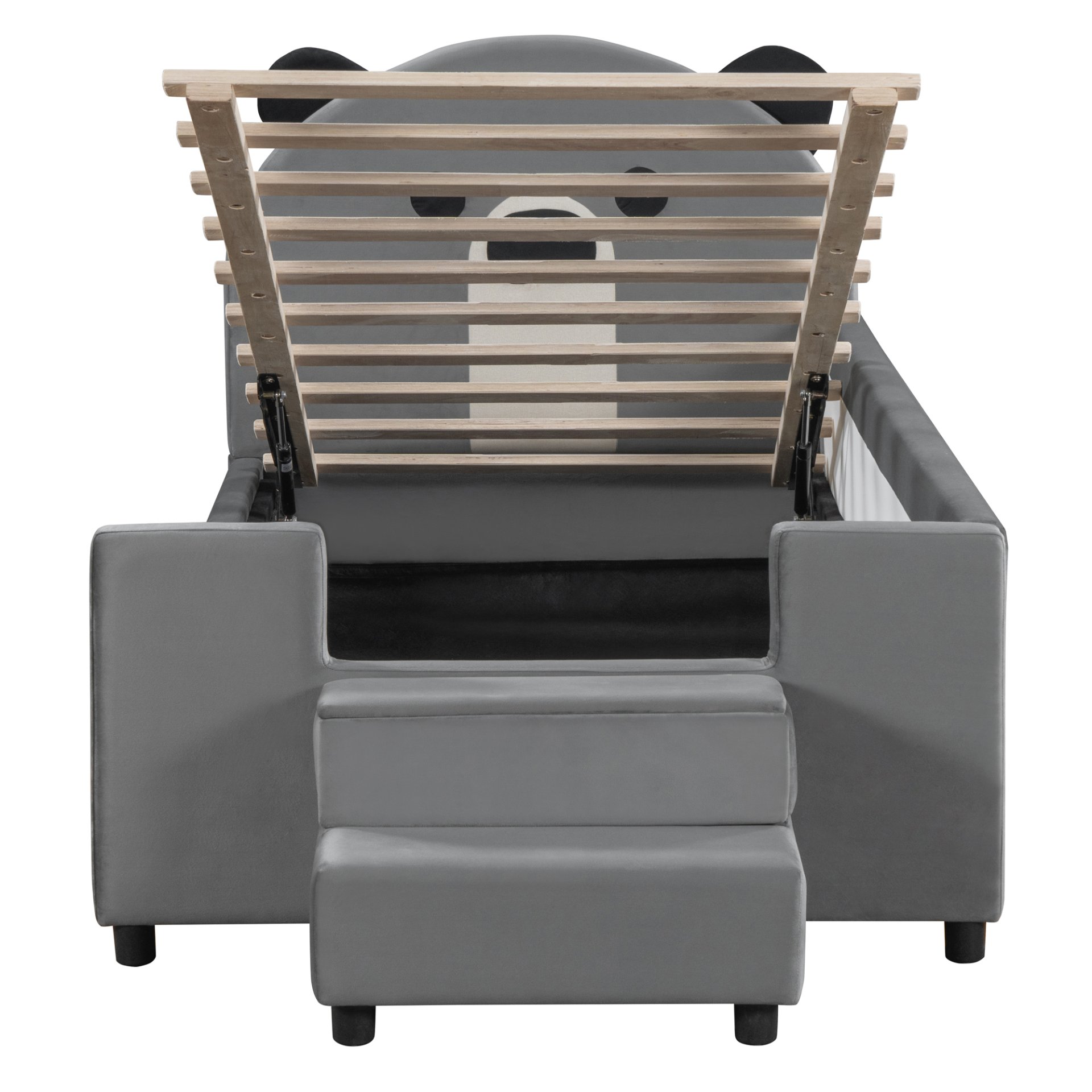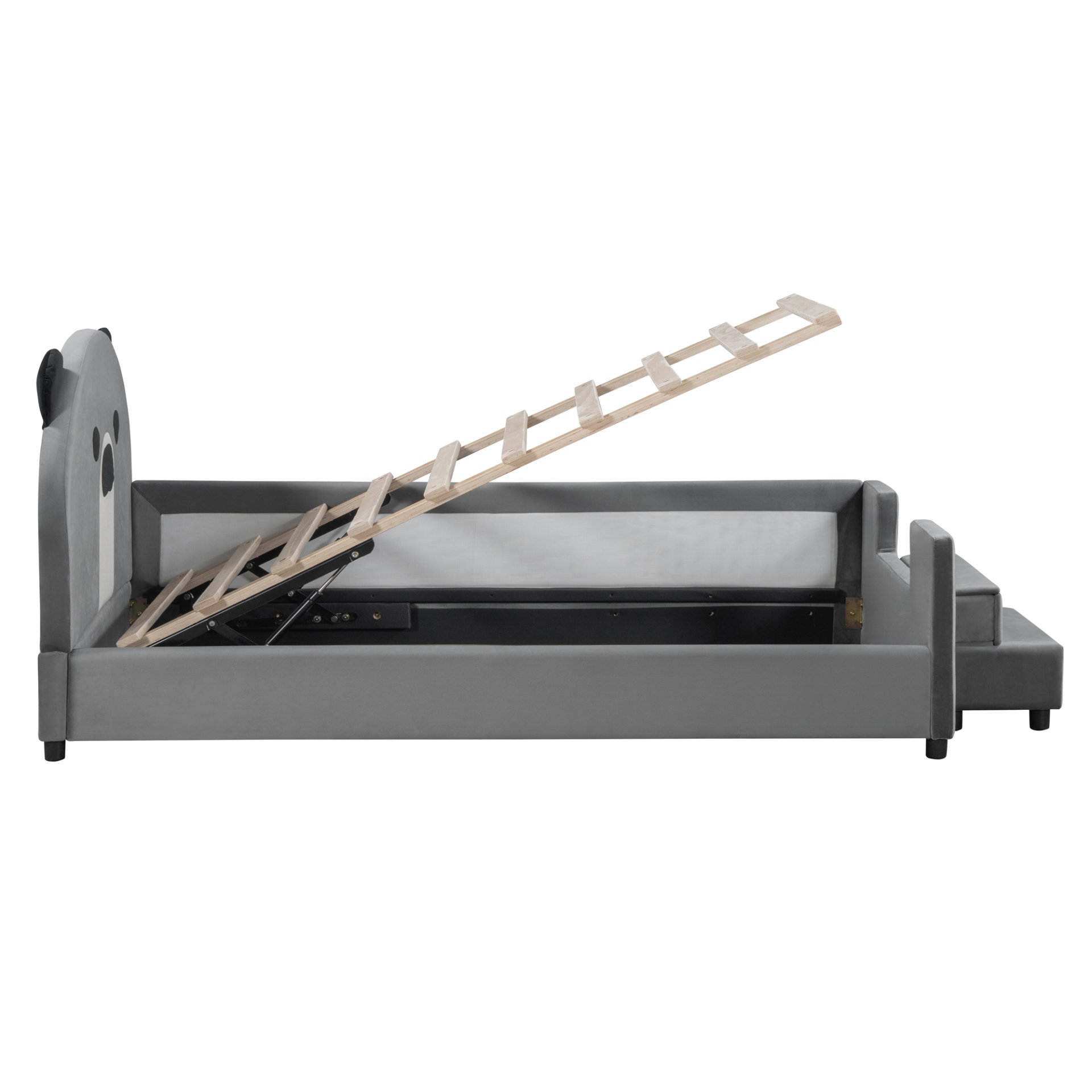 This charming daybed combines modern aesthetics with playful functionality, featuring a delightful bear-shaped headboard that doubles as a cozy backrest. Crafted from durable pine wood and MDF with splayed legs, its low-profile design brings contemporary flair to any space. The innovative hydraulic storage system beneath the mattress offers discreet space for bedding storage, while the optional breathable mesh fence ensures safety for little ones.