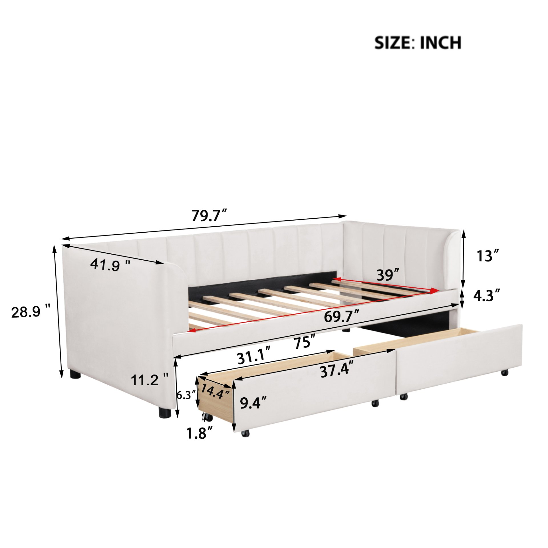 Overall Dimensions: Overall Product Dimensions 79.7"L x 41.9"W x 28.9"H. Mattress not included.