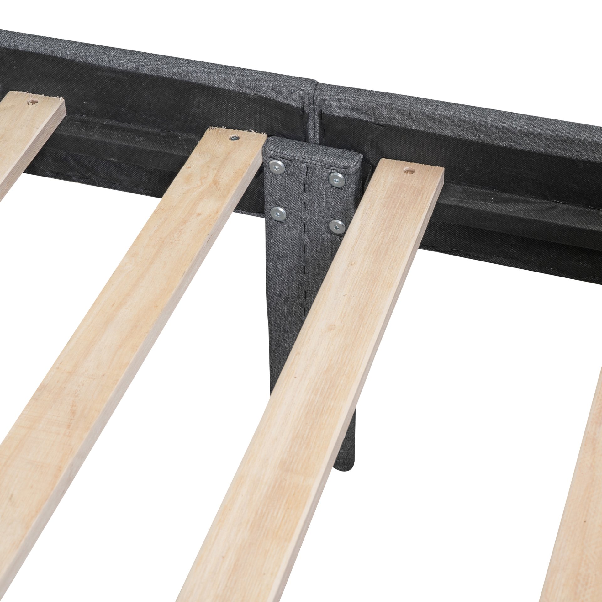 This twin-sized bed frame comes with 10 wooden slats, so no box spring is needed. Mattress not included. The headboard is included as a comfy linen fabric backrest, bringing you and your partner a cozy feeling.
